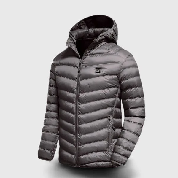 - Doudoune chauffante grise avec capuche pour homme et femme.