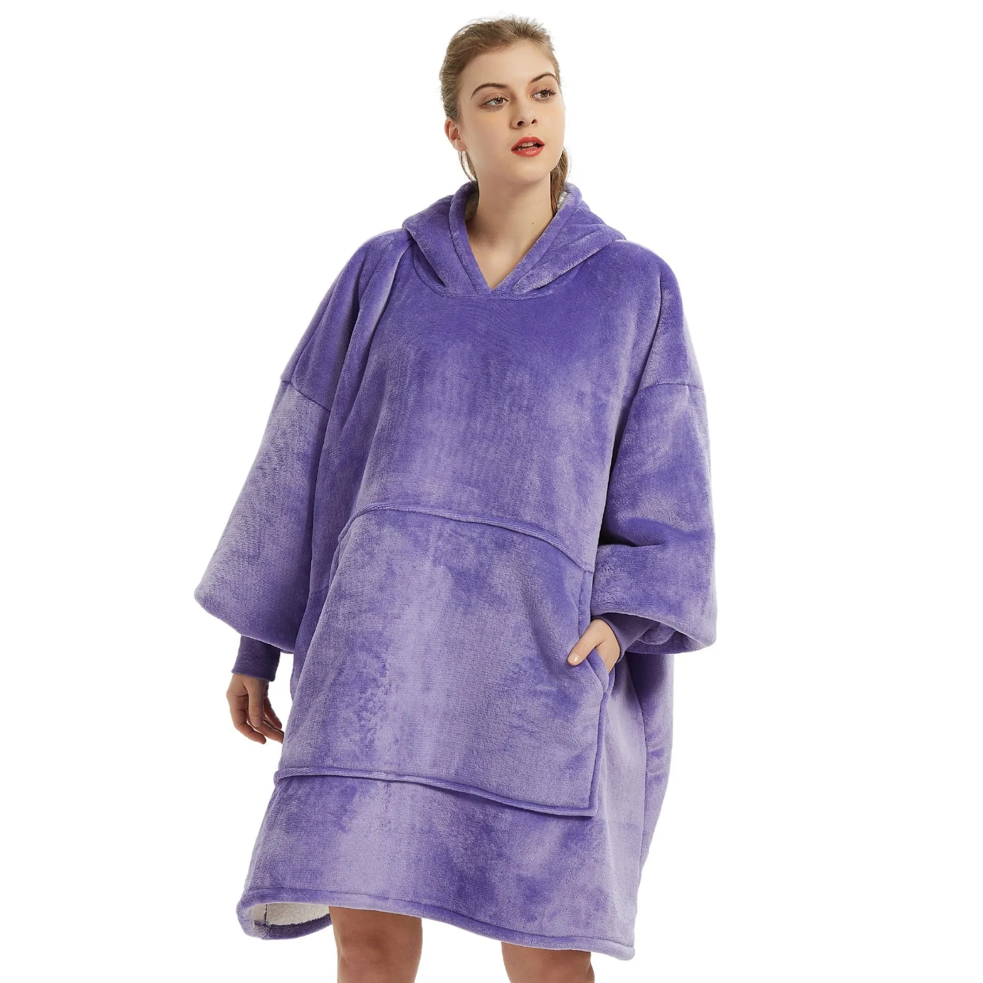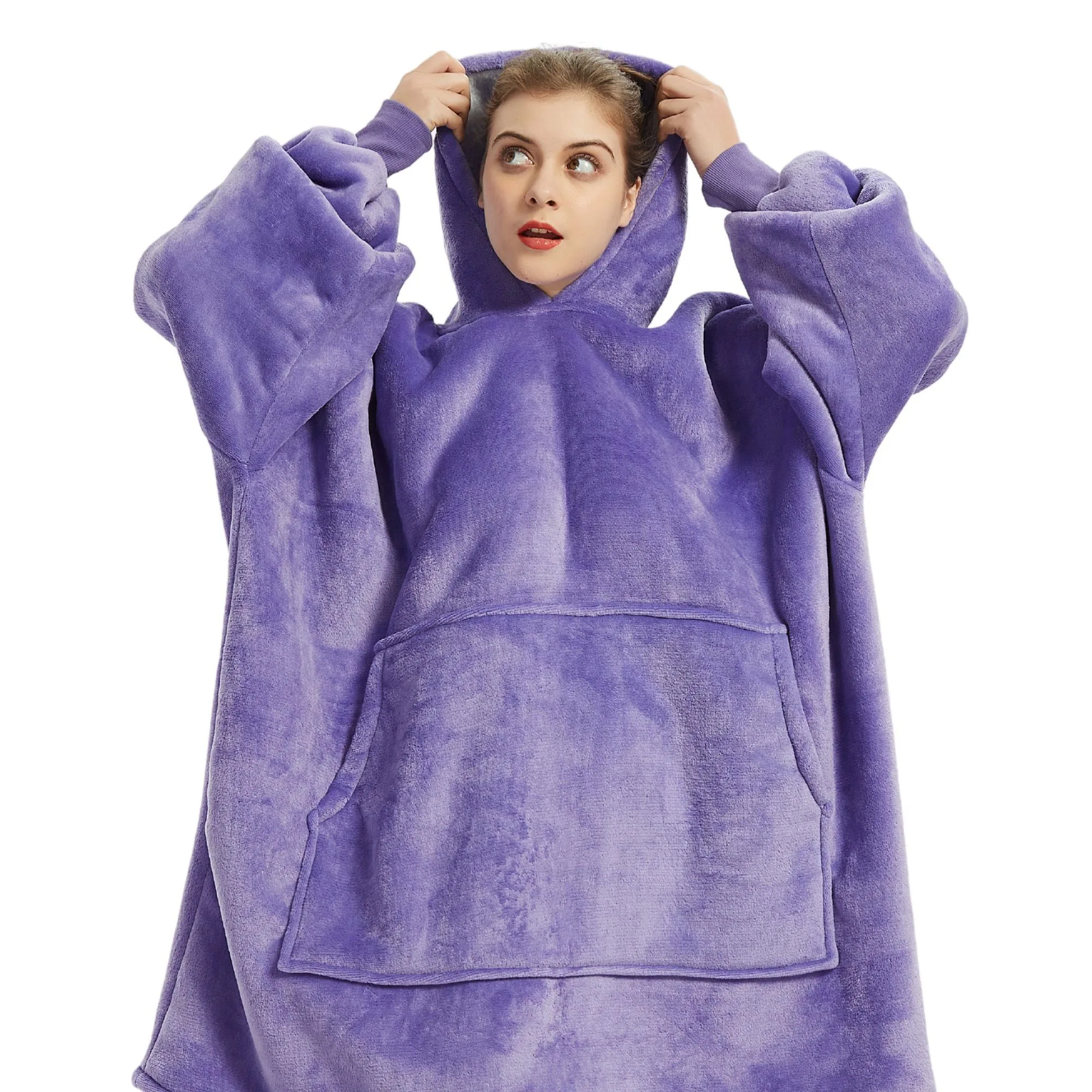 - Pull plaid violet avec capuche géante et poche centrale.