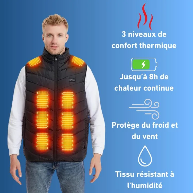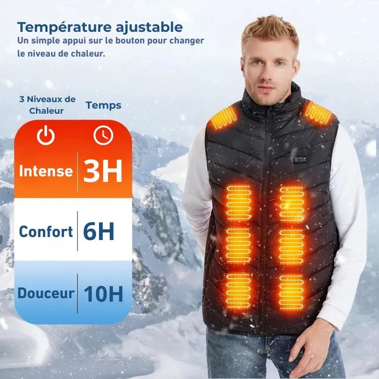 - Éléments chauffants intégrés pour une chaleur constante sur le torse et les épaules.